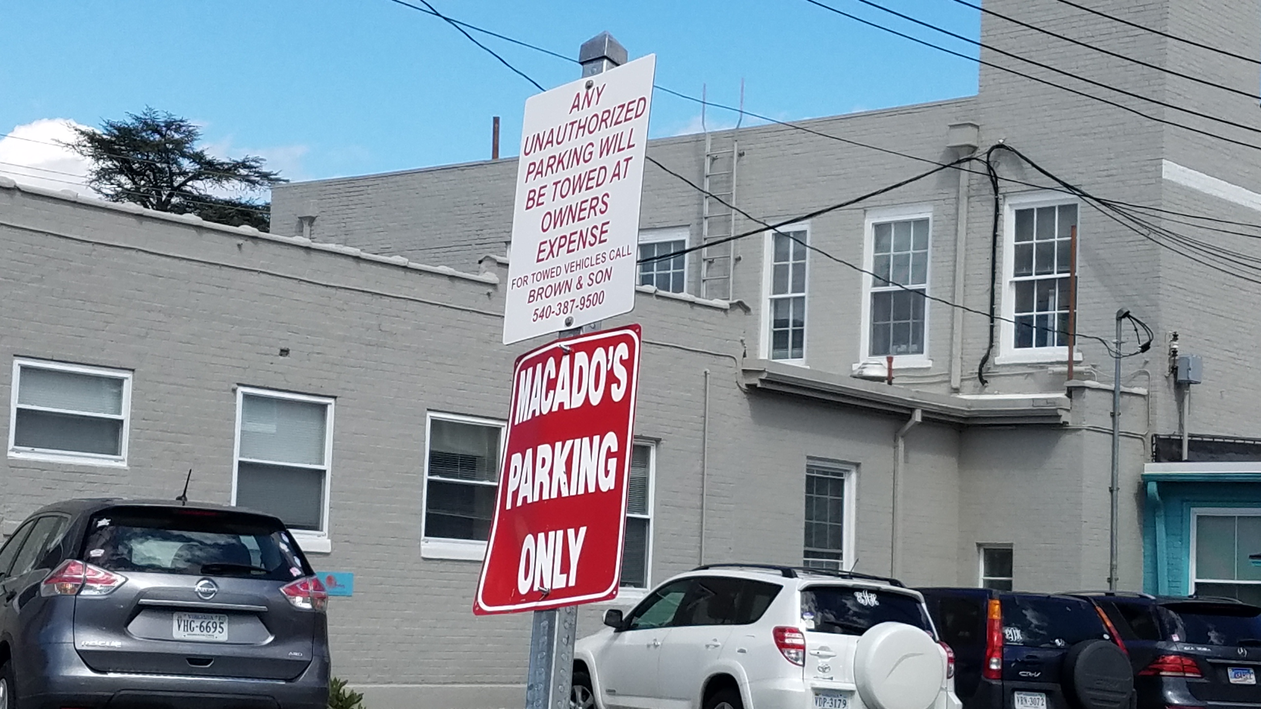 No parking on the front side of Macados, but I saw that there was a side street and apparently parking in the rear. The street behind Macados was partially closed, road work going on. I travelled a circuitous route around Roanoke College and found my way behind Macados. I turned into the parking area which was full. I found an empty space near the street and pulled in, but as I got out of my car, I saw a sign on the wall of the nearby building that this parking was for Faculty & Staff of Roanoke College. I got back into my car and made the loop through the parking area again. No vacancies. I saw a couple of young guys walking out to the parking area. I hesitated briefly and then turned in again for another go around. The young guys had made it to their vehicle and were pulling out, leaving me with a space to park.
