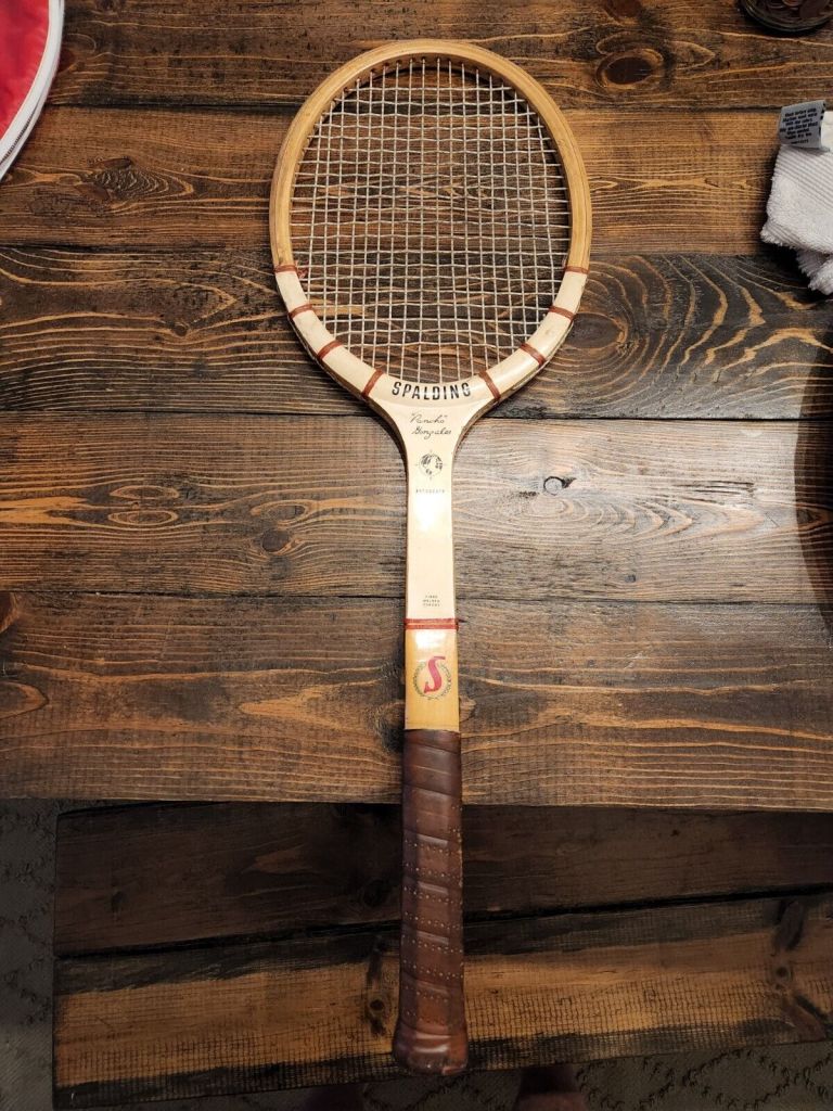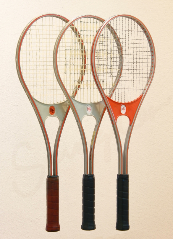 Of the racquets shown above, my favorite was the Red Head. The Head racquet with the brown plastic throat piece is hauntingly familiar, so I must have had one of those. I know I had a Pancho Gonzalzes signed wooden racquet, that I eventually painted solid blue. I strung it with fishing line once, and it only took one swing of the racquet for the ball to slice through the fine string. But, I also strung it properly, but unaware, I began to have incredible shoulder pain. It finally dawned on me to stop using this wood racquet because it was injuring me. I hit a few times with a T-2000 racquet, but don’t recall if I actually owned one, but remember stringing one and hated the extra effort it required on the Wingfield stringer. I hit with the green Yonex that someone else owned, but didn’t like it. I think the aluminum frame was too light and didn’t give me power on the ball.