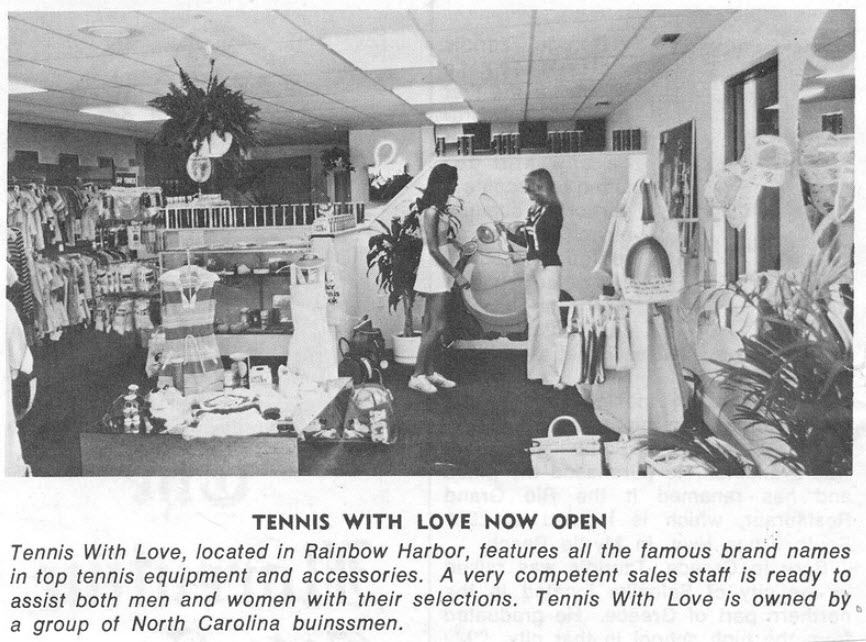 I had graduated from UNC-Wilmington the previous year (1976) and was playing a bunch of tennis, living with my mother in Jacksonville, North Carolina. I don’t recall how I met Doug Echols, but he was the Wilmington businessman who purchased the name, “Tennis With Love” from some ladies who had a small tennis specialty shop, with that name, in Wilmington, NC. I interviewed with Doug and he selected me to be the manager of “Tennis With Love” located in the Rainbow Harbor shopping center in Myrtle Beach, SC. *I thought TWL had closed in Wilmington until I was googling this morning and found they had moved down Oleander Drive into a small house. I drove by this location just yesterday & didn’t see the sign. Might try to stop by sometime now that I know they are still active. I thought it was just a women’s tennis shop, but I see by visiting their current web site that it is not.