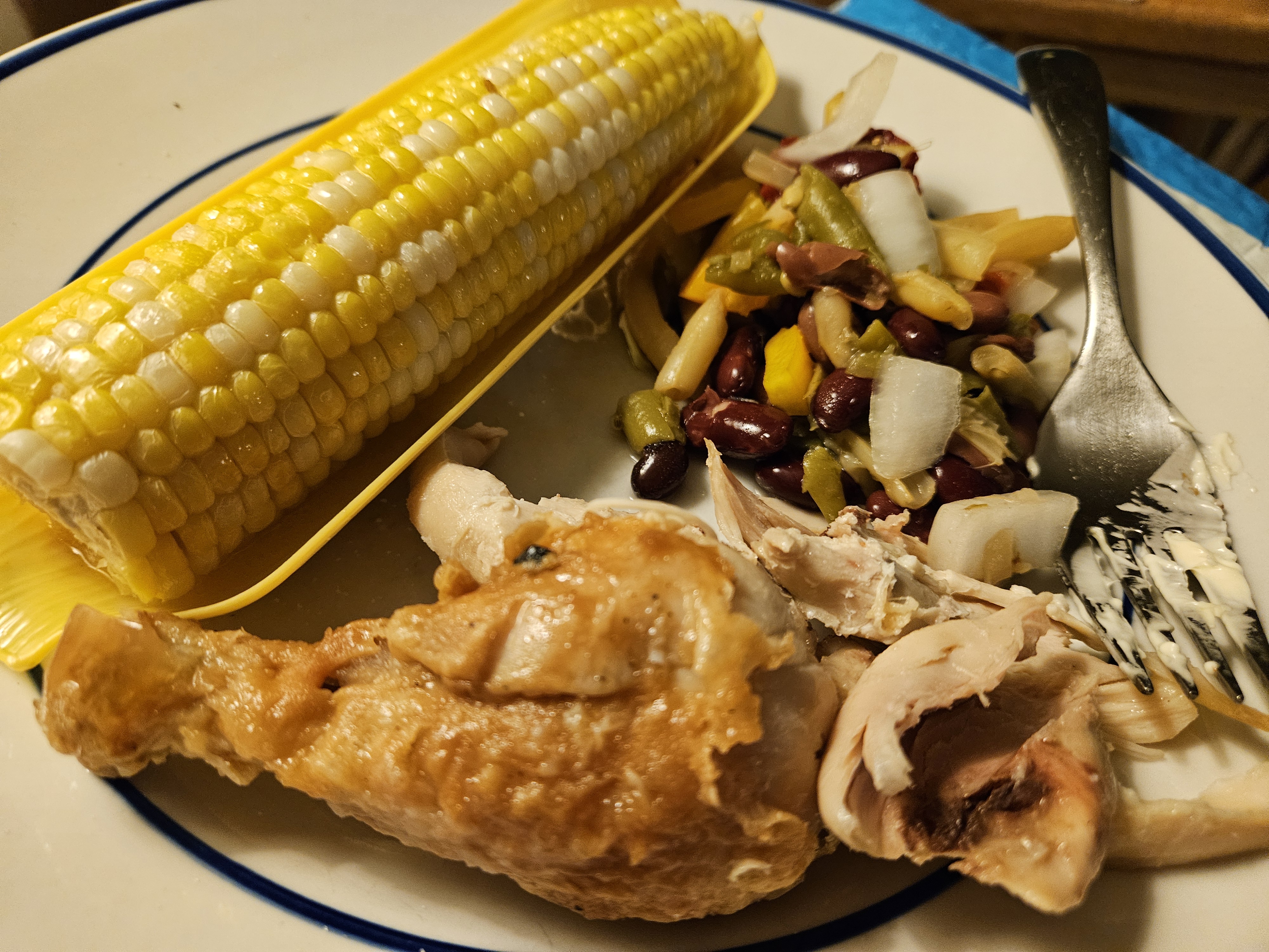 About once a month or a month & a half, I buy a whole rotisserie chicken from Harris Teeter. It costs less than $8 for the whole cooked chicken. I can make four or five meals from this one chicken so it is very cost effective. Two breasts (maybe 4 oz. of white meat each), and two drumsticks with some white meat (3 oz. each), and then pick off the remaining meat to make chicken salad. Cabbage slaw and some baked beans would go well with the chicken.