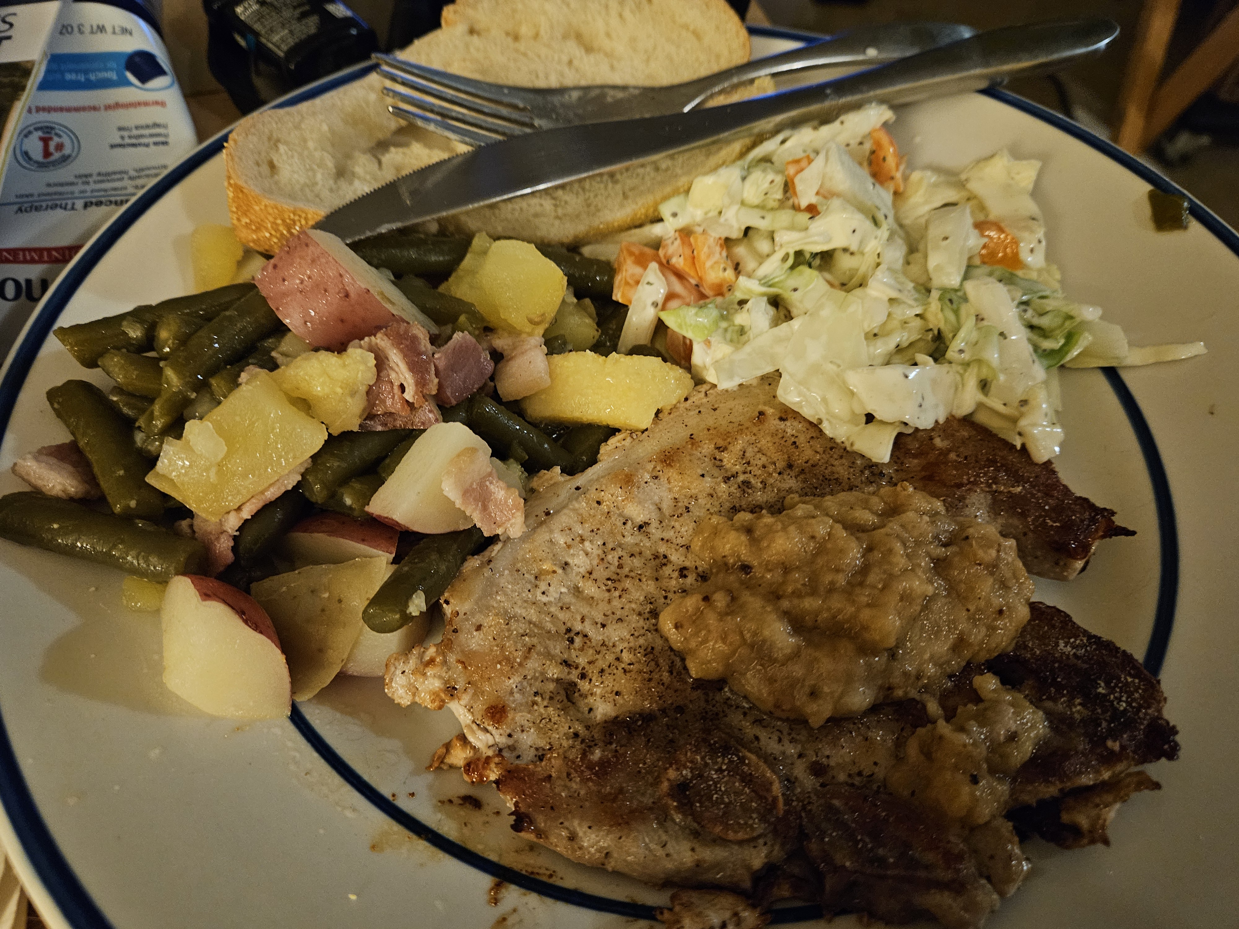 I cooked one chop in my large frying pan that is all metal so that I can put it in the oven. I set the oven to Broil on LO. Normally I cook steak or lamb on HI but those are not usually thick cut. I really only like the Round Bone Lamb Chop because I think it’s flavor tastes better. I figured that the thick cut pork chop would burn to a crisp before the inside was done if I set the Broil to HI. The LO setting worked and I flipped the chop after the top started to crisp up. And, this chop was delicious and tender. I only cut off about a third of the chop and that was enough. I had some fried okra & onion, and an ear of corn on the cob, and some corn chips with guacamole.