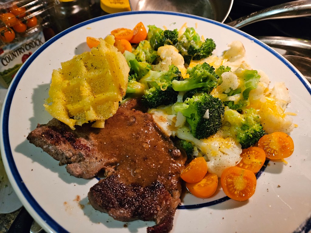 Finally I thought through this dilemma and decided that I would cut the ripe avocado in half and eat half now and make guacamole out of the other half. I could refrigerate the guacamole and it might last for another couple of days, so I might be able to skip a day between eating the whole fruit. *I try to cycle through the different types of food/meals I prepare. I don’t want to eat steak every day, or chicken every day, or steamed cabbage for every meal, so I try to change my entrees and sides. I’ll eat chicken in a stir fry today, and a pan fried pork chop for the other meal. I might steam asparagus, cabbage or cauliflower for one side and maybe fix a cucumber/onion salad in sweetened vinegar or stewed Roma tomatoes to go with whichever other side I’ve chosen. I may choose a hot side to go with a cold side. I like a microwaved Russet potato with butter & sour cream as a side and I might eat steamed asparagus with that choice. Cabbage slaw made with Dukes’ Mayo and some Half-n-Half might go well with a pork chop. I like a hamburger or maybe a large Sweet Italian Sausage patty that I might put on a ciabatta roll (or half of a roll).