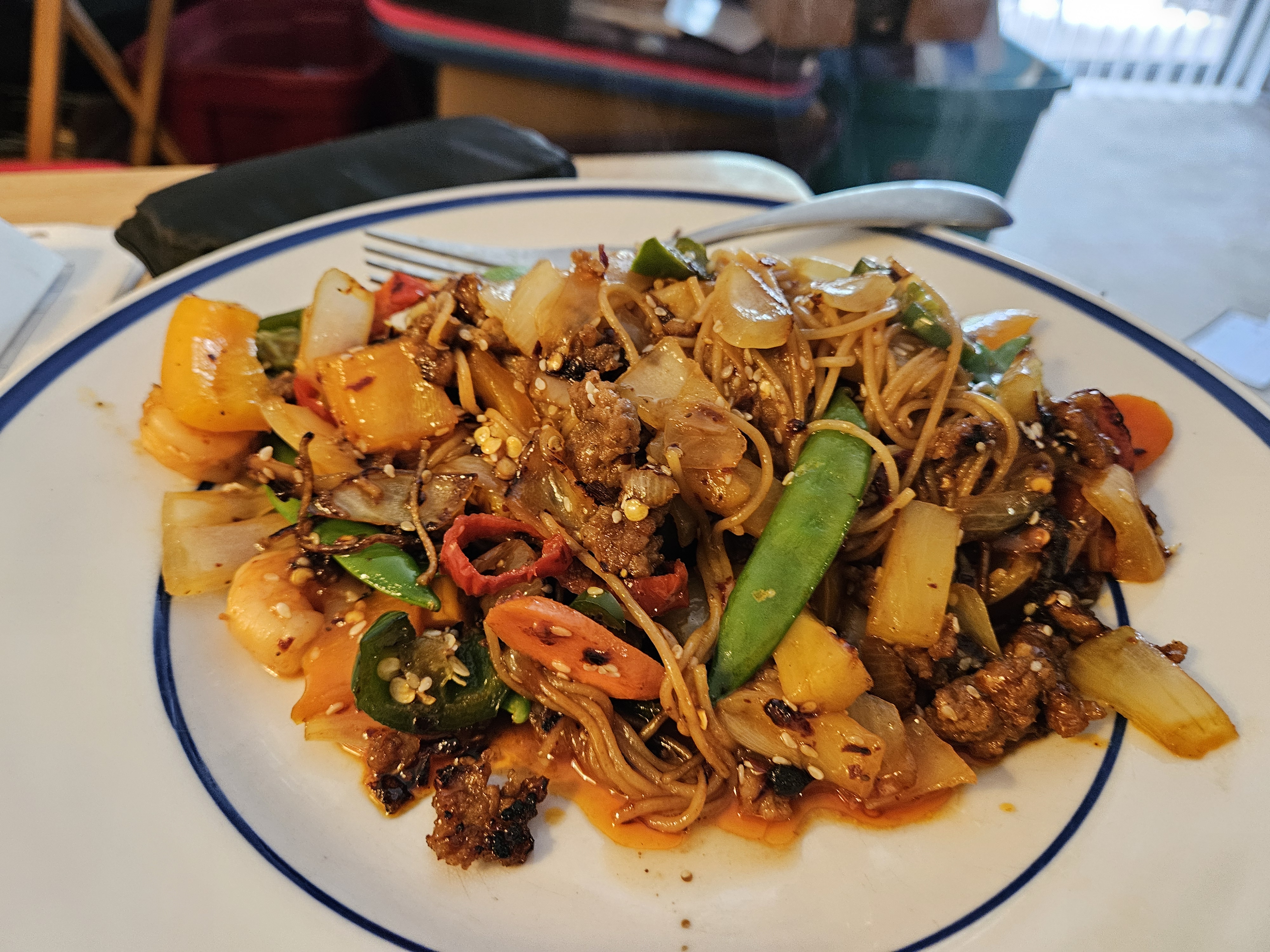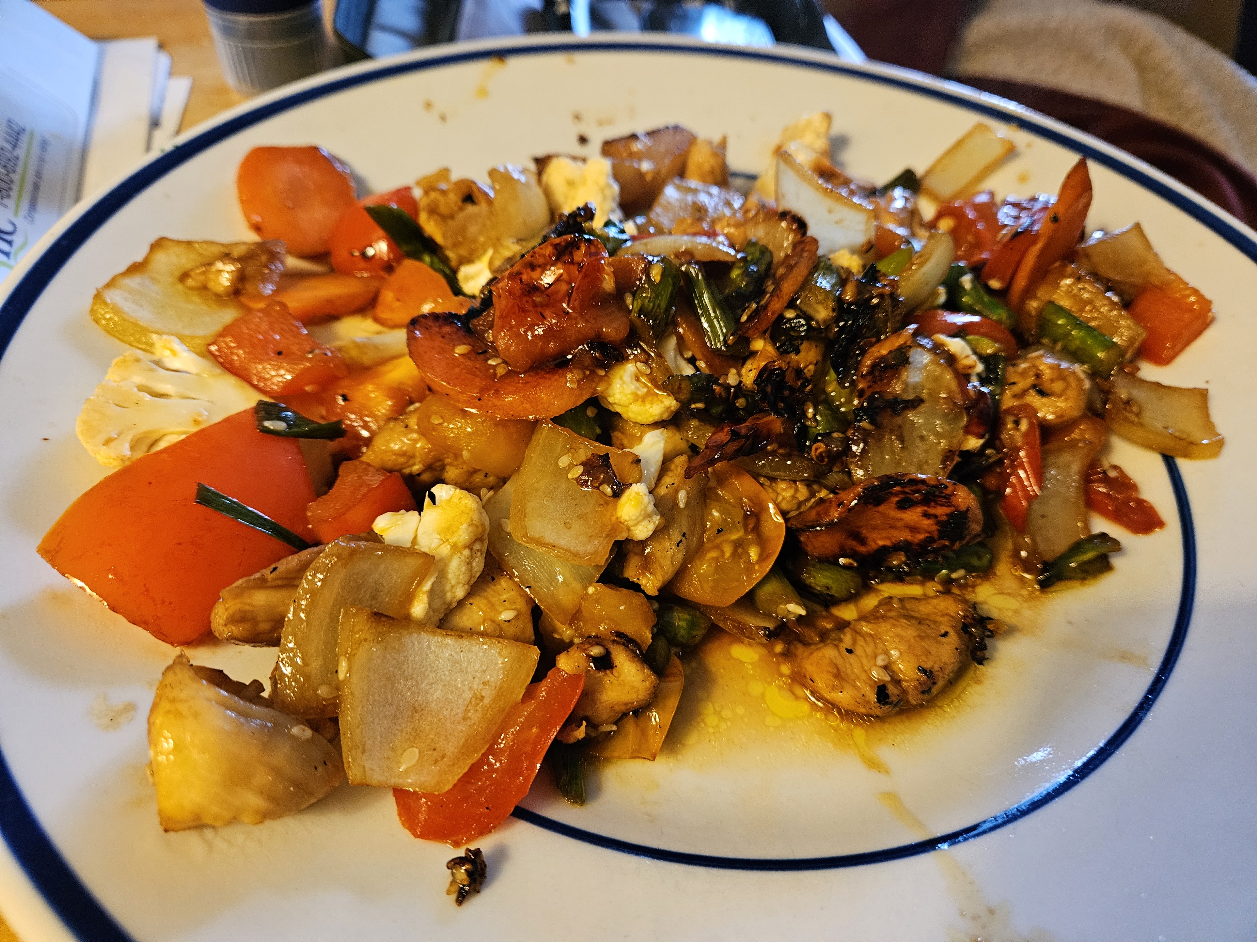 I haven’t quite mastered my stir fry. Chicken usually, but shrimp, or pork or even beef sometimes. Carrots, tomatoes sweet bell peppers and onion. Toasted sesame oil and some soy sauce with garlic powder. There is a “crunchy garlic” paste that I also like.