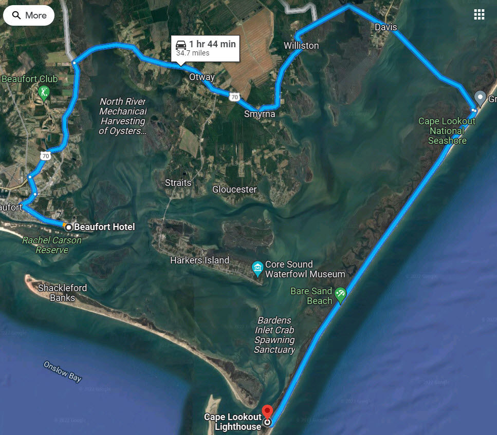 It was only in the last few years that I began to ask myself how close the Cape Lookout Lighthouse was to Beaufort/Morehead City/Fort Macon. If you don’t have a boat, the trip from the Beaufort Hotel to the Cape Lookout Lighthouse would take almost two hours (34.7 miles).