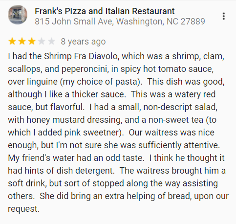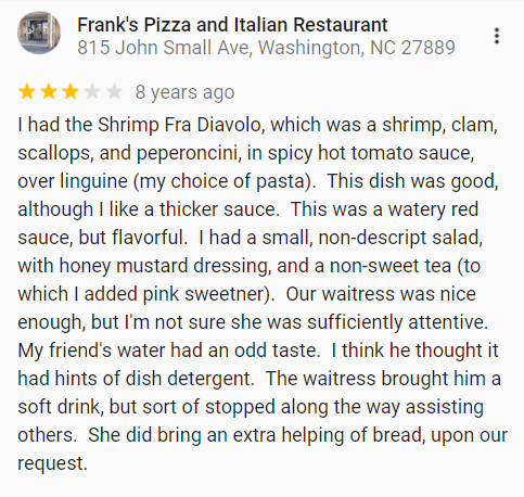ADDENDUM – ADDENDUM [11/11/21]: I happened upon my online restaurant reviews (apparently 250 of them to date) this morning and happened to find the one for the first time I had “Shrimp Fra Diavolo” (I had only remembered it as “Shrimp Diablo”.) at Frank’s Pizza and Italian Restaurant in Washington, NC.