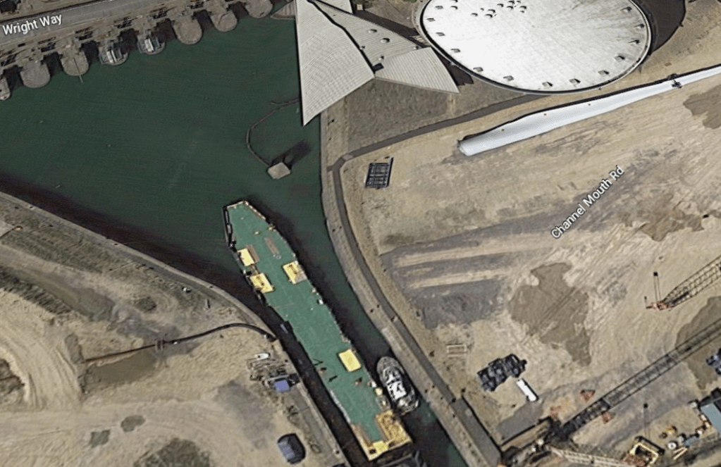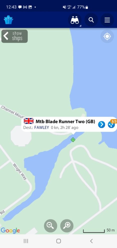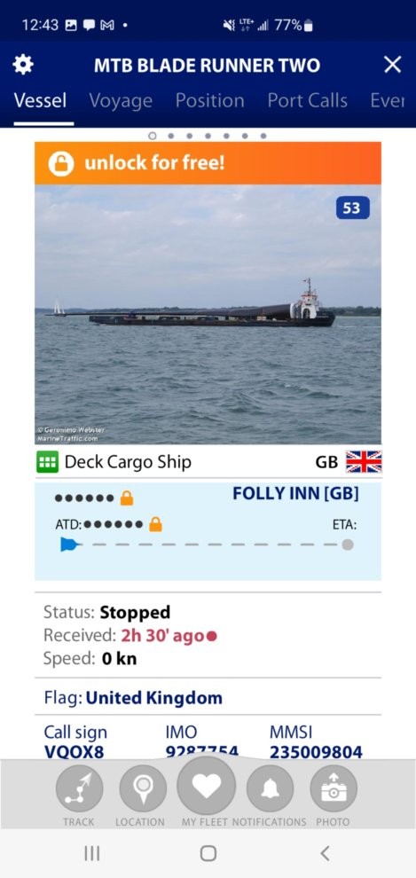 I was using the maritime app to look at vessels near Southampton, and happened to see a vessel in the Fawley Power Station channel. Sure enough, it was the barge used to ferry wind turbine blades from the Isle of Wight (where they are manufactured) and storage at the Fawley location. I don’t recall if I noted the name of the barge, long ago, but seeing it on the maritime app, “Mtb Blade Runner Two” made me check the photo I had of the barge with one wind turbine blade. Sure enough, if you zoom in on that picture, the name is written on the bow of the barge.