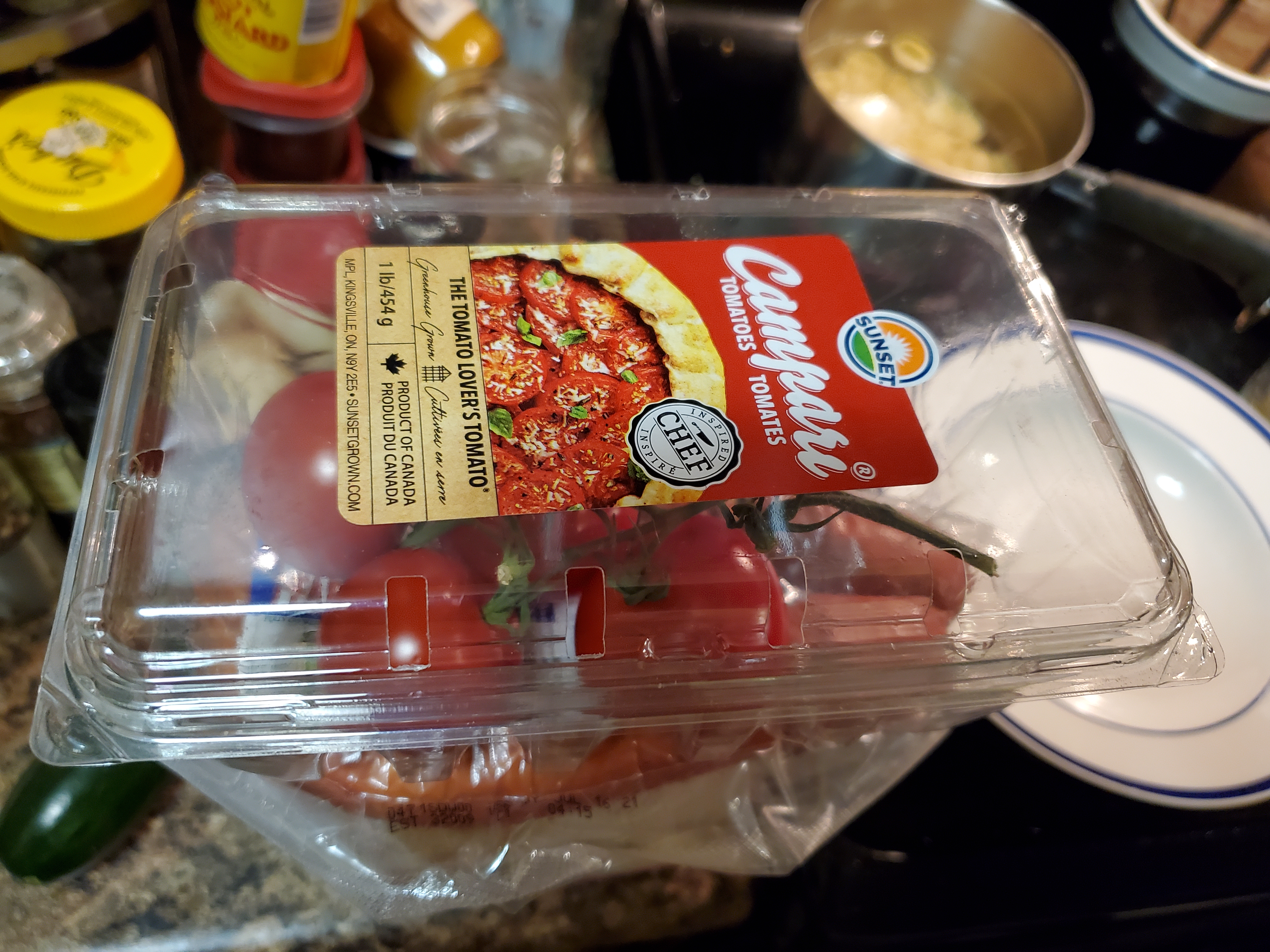 But, necessity is a mother, and all of a sudden I thought, “do I have a can of squash somewhere.” Couldn’t find one, and then the brilliance came to me. I have several cans of the Zucchini in Italian Tomato Sauce by Del Monte. And the way the tomato sauce is made in this, it is a lite tomato sauce. When I made this meal using fresh zucchini, I usually put just a few small tomatoes in toward the end because I only want a little tomato flavor, and they don’t overpower the rest of the ingredients and they form a light red sauce. So, instead of using fresh zucchini, and putting in some small grape tomatoes, I just added most of a can of the Del Monte Zucchini in Italian Tomato Sauce. It worked great, although not exactly flavored as usual, but also meeting most of the requirements. *And, there was just enough for once serving. I got some Biqhino peppers at the Farmers Market in Raleigh over the weekend and added several to this meal. [end]