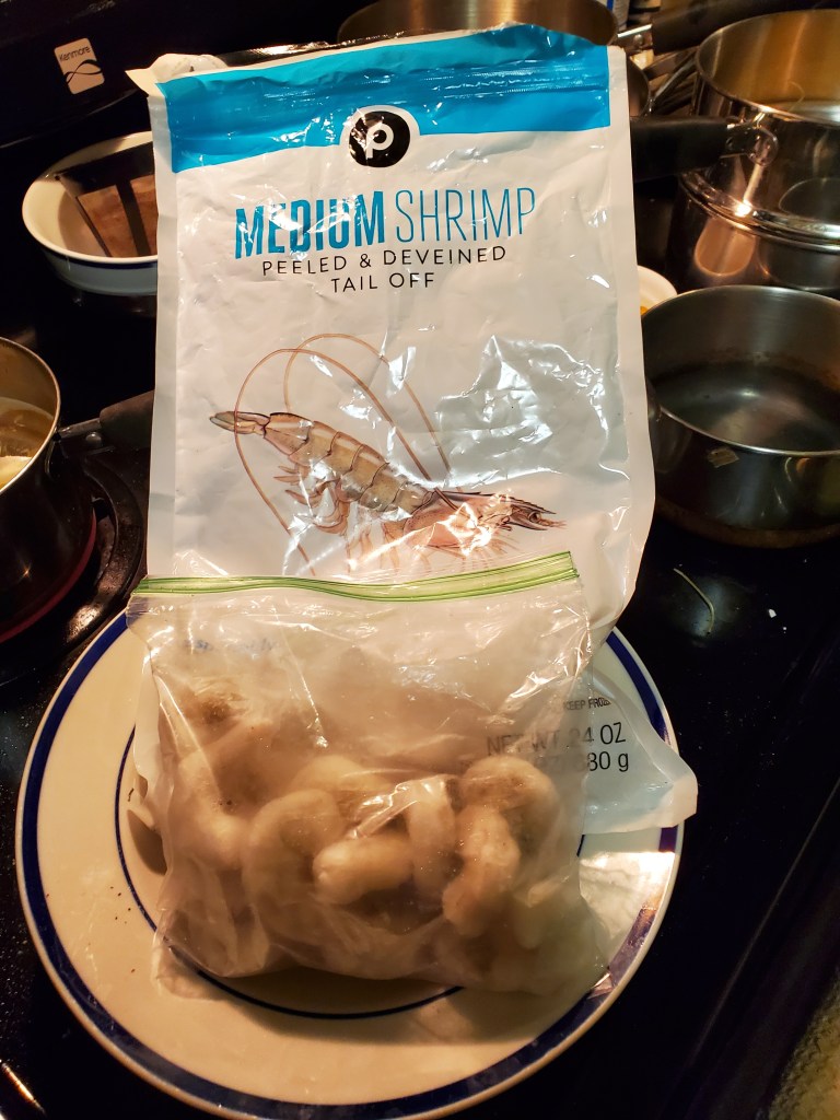 The frozen shrimp come in a package from Publix. I found that I could divide the shrimp into about 5 or 6 smaller packages, putting them in smaller plastic bags, and then store those in the original package. So, I think the shrimp were from $11 – $14. Get the peeled, deveined with tail-off frozen shrimp. You definitely don’t want to have to peel these, and tail-on is just one more thing to peel. I was surprised that the smaller packages of shrimp still had about 15 medium shrimp (which could be cut in half for a more “bite-sized” meal). **Oh, I put the smaller frozen shrimp package in a bowl and defrost it in the microwave for about 15 minutes, while the other items are cooking in the pan.
