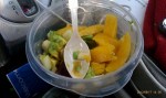 I’ve been to the State Farmers’ Market in Raleigh several weekends, and have been eating loads of tomatoes, corn on the cob, okra (just this last week), sweet peaches, cantaloupe, etc. And from Compare Foods across town have gotten some golden colored mangoes, avocadoes, and limes. *About a month ago, I got my first few golden mangoes, and got a recipe online for an avocado, mango, pineapple & chipotle pepper (with lime juice, instead of lemon juice). I thought it unusual the first time I tried it. I liked it better the second time I made it, and by the third time, I was in love with the flavors. Mangoes are odd to peel and cut up. These golden mangoes have a large oval, but almost flat seed pod which is minorly difficult to cut around.