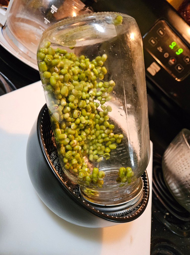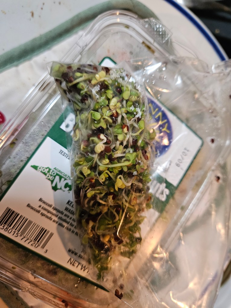 Okay, so I don’t know enough about baseball to know how to tell you that I’ve just got 2 out of 3, when attempting to sprout some new, to me, seeds. I can’t even tell you, without looking, which the 3rd seed is. I know the broccoli seeds have sprouted wonderfully. They started off slower than the Mung beans which sprout completely in about 3 or 4 days. The little white fibers didn’t appear until about the 4th day, but then during the next couple of days they spiffed up. And from 2 tbl. of seeds, I got a production of about 4 oz. of finished product. The white shoots are smaller and shorter than the commercially grown versions I’ve bought from Sunny Creek Farm (of Tryon, NC). I cleaned out one of the SCF clam shells and put my sprouts in it.