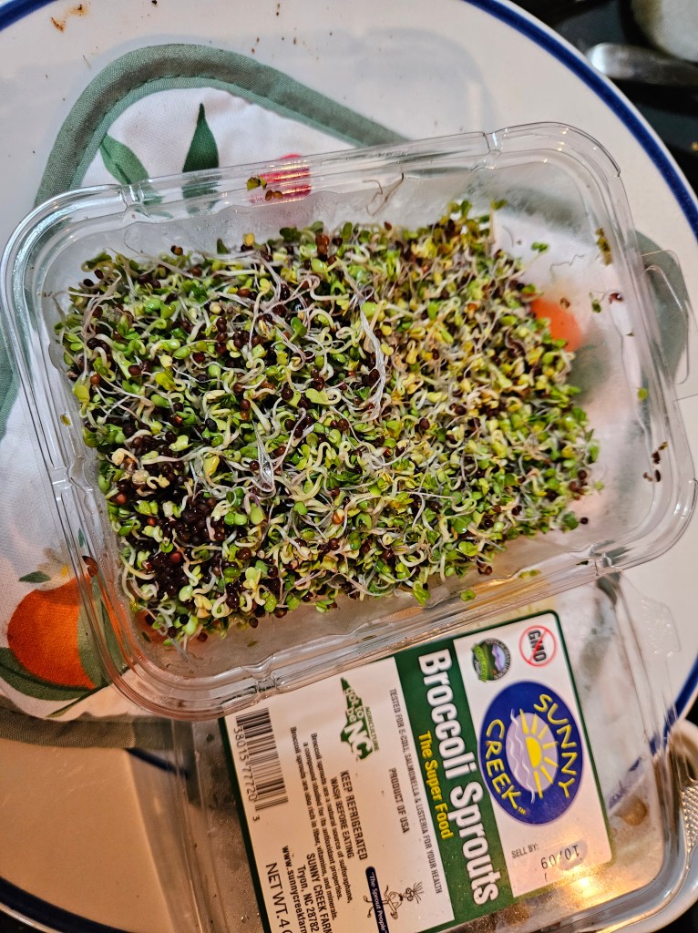 Recall that broccoli is a cruciferous vegetable and that adding ground mustard seeds (in my case black mustard seeds) to it, or other cruciferous veggies, including broccoli sprouts, produces sulforaphane, which activates the body’s antioxidant and detoxification defenses and is studied for its potential health-protective effects.