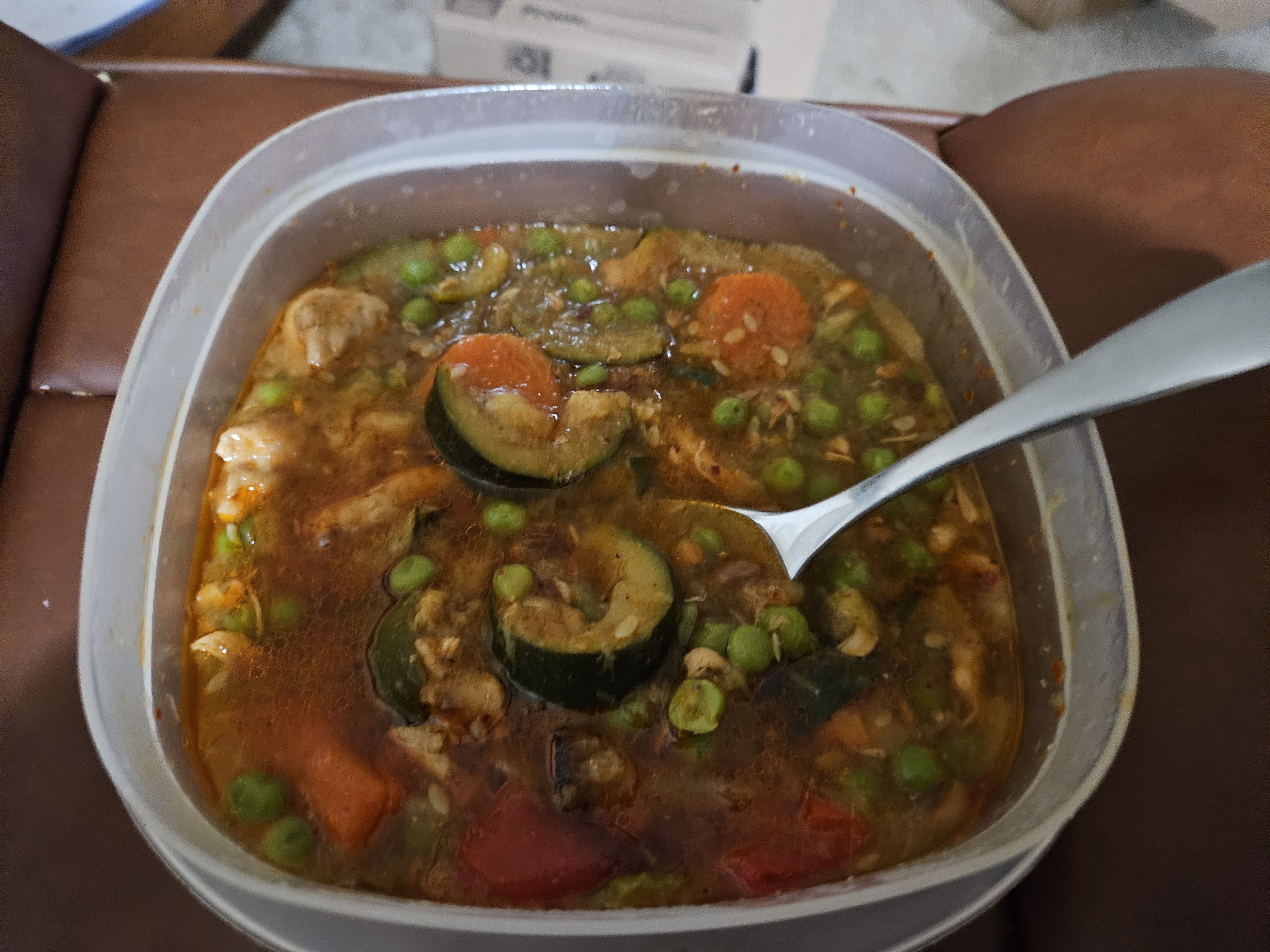 I had some left over Frogmore Stew items: a third of an ear of corn, a few potatoes, shrimp, okra and Andouille. I had the left over pot liquor from a second Frogmore Stew in the IP Mini. It wasn’t too salty, so I combined the two into a soup. Worked great, although it is odd to eat the wet corn on the cob from the soup. But worth it!