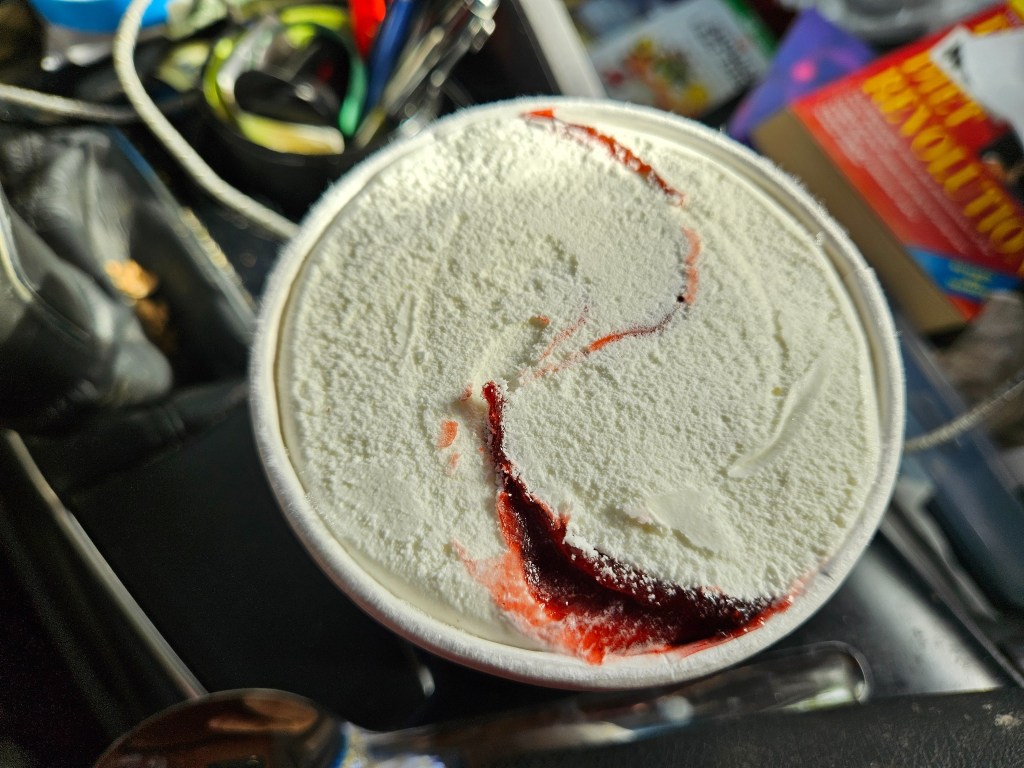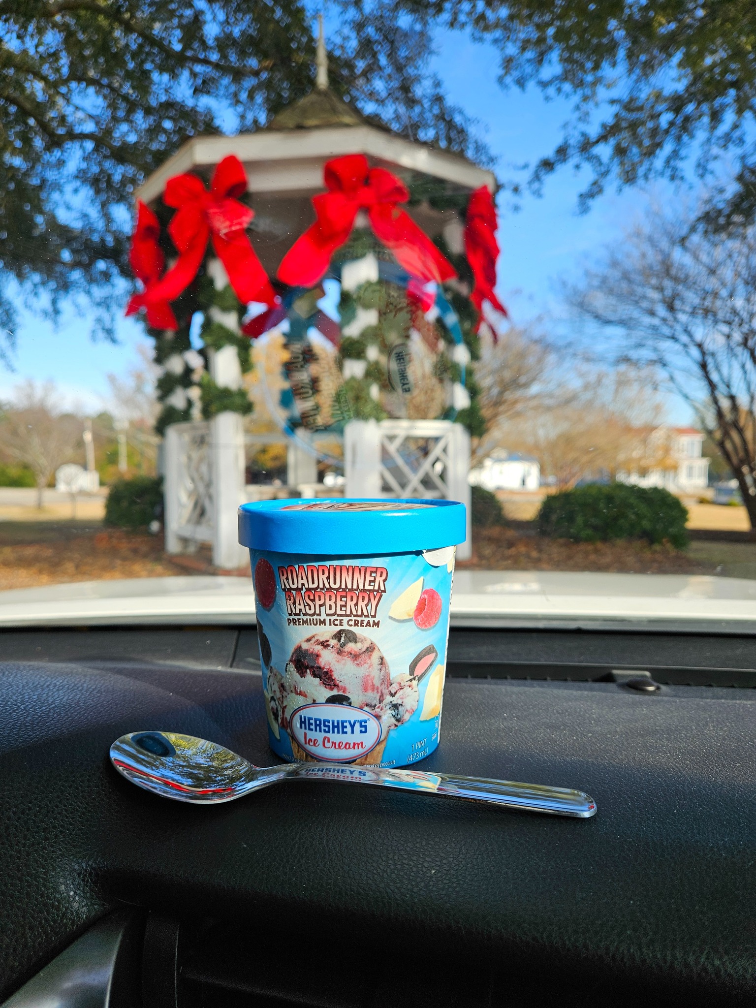 But, when I got to the IGA in Rockingham (Edwards, I think.) I found that they had a pint (maybe two) of Hershey’s “Roadrunner Raspberry” Ice Cream for $3.99. I was so happy to finally find it that I bought a pint for a lady that was passing nearby. Her choice and she chose “Dulce de Leche” I think.