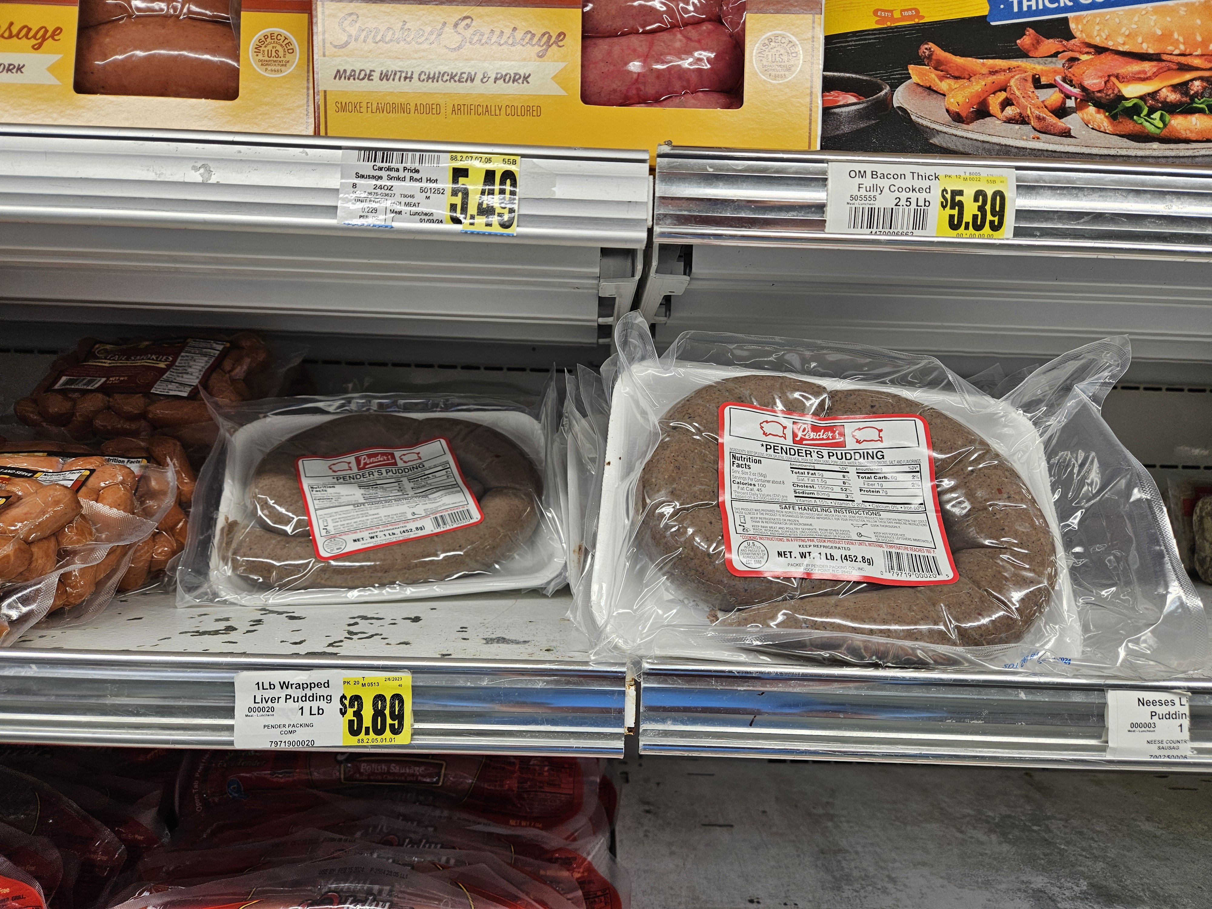 [NOTE 02/08/24]: I’ve mentioned cooking this breakfast elsewhere but I’m not sure I’ve ever stated the brand of “liver pudding”. This is “Pender’s Pudding” and I originally bought some at Pate’s Farmers Market (across town, in Fayetteville). But, I have since realized that there are other grocers that sell this. I think I bought some in the Carlie C’s and here is the simple process I used to figure it out.