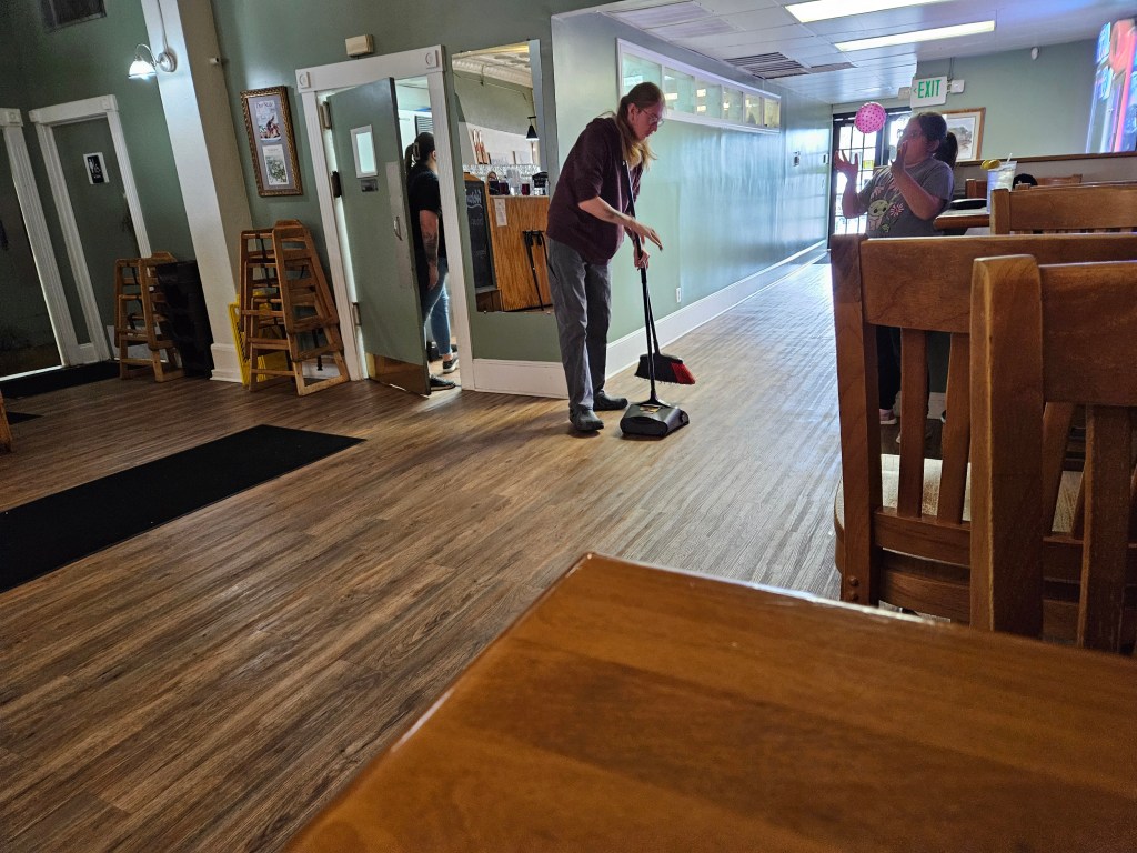 I was seated at a slightly different angle my last visit to Down on Main Street, and I think the black throw rug was in a slightly different position, but here was the kitchen door where the waitress came out of and did her dance with the woman customer coming out of the nearby Women’s Bathroom, and spilling some items. But note the man sweeping. Several of the men were in what I would call “a cleaning mode” which is definitely something I don’t have. I’m nasty, but it doesn’t mean I don’t recognize “clean” people, and even appreciate them.