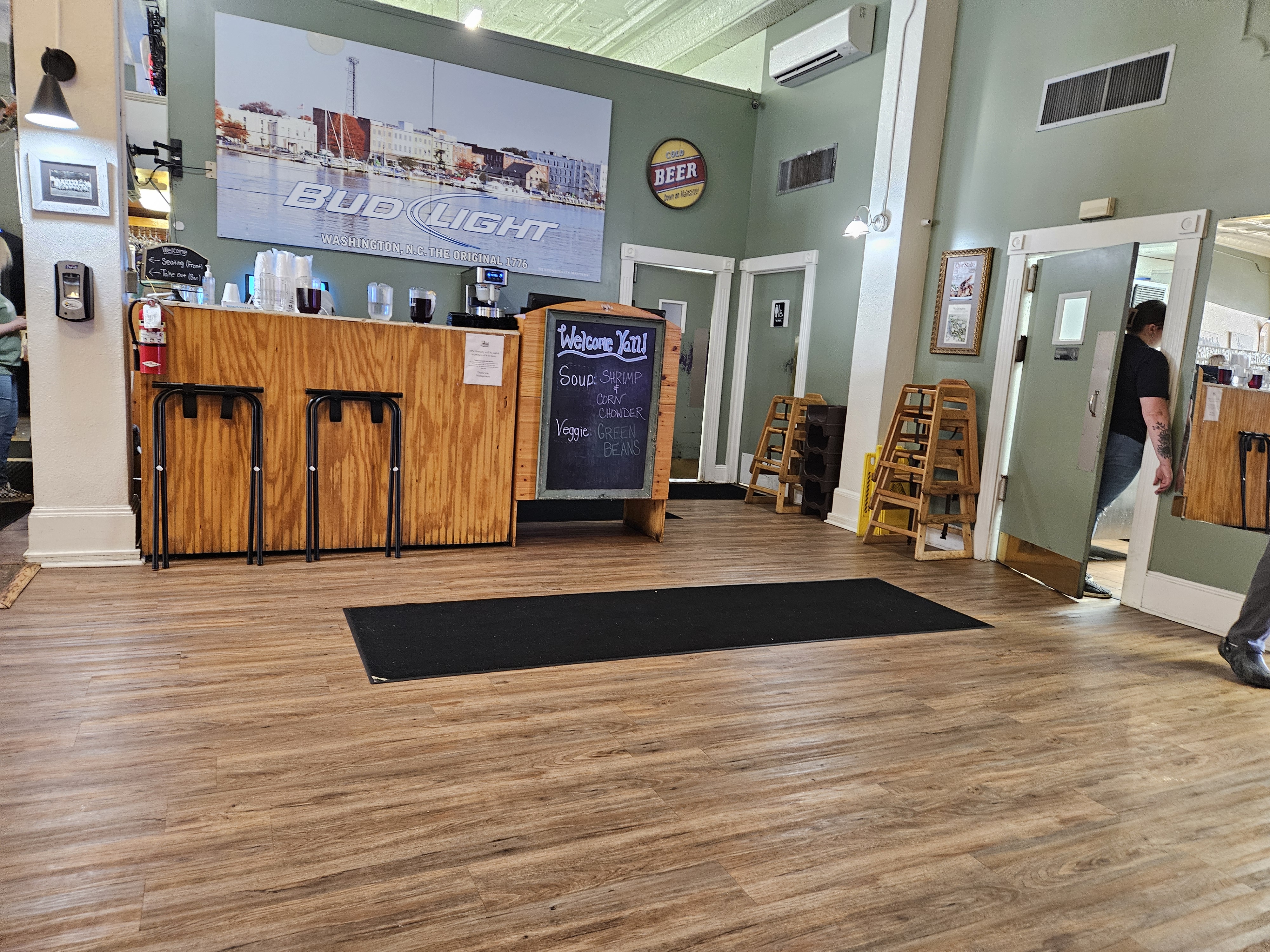 I was seated at a slightly different angle my last visit to Down on Main Street, and I think the black throw rug was in a slightly different position, but here was the kitchen door where the waitress came out of and did her dance with the woman customer coming out of the nearby Women’s Bathroom, and spilling some items. But note the man sweeping. Several of the men were in what I would call “a cleaning mode” which is definitely something I don’t have. I’m nasty, but it doesn’t mean I don’t recognize “clean” people, and even appreciate them.