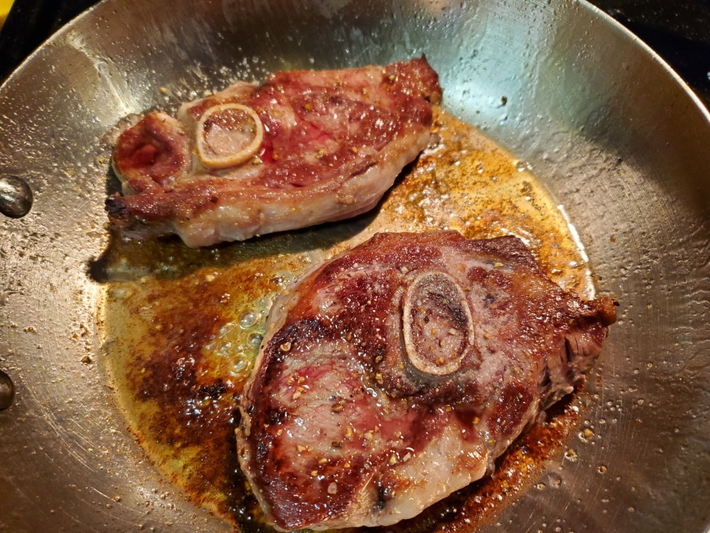 I mentioned the “oven safe” wok first because it is perfect for broiling a couple of round bone lamb chops in the oven.