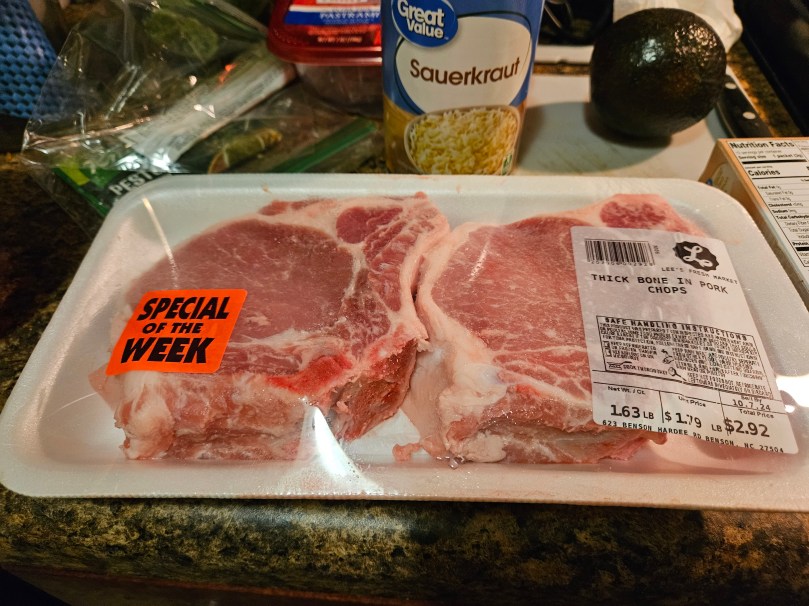 Since seeing Lee’s Fresh Market ad on TV, and then tracking them down just a couple of miles outside of Benson, North Carolina, I have shopped there repeatedly. It only takes me about 37 minutes one way, back through Erwin to get there. The two things I’ve bought the most there have been their Pepper Bacon and their Thick Cut Pork Chops. As long as the pork chops are on sale, what a deal! I can make at least 3 meals out of each pork chop. If they are a pound each, and even with the bone, you are still going to get a 3.5 or 4 ounce chunk of meat, and they are delicious when broiled in the oven.