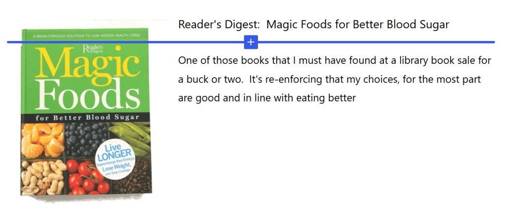 One of those books that I must have found at a library book sale for a buck or two. It’s re-enforcing that my choices, for the most part are good and in line with eating better. There is a test on pp. 60-61 regarding my current eating habits, and I think I did pretty well… Yeah, I did. I just checked and I scored a 27 which was pretty good.