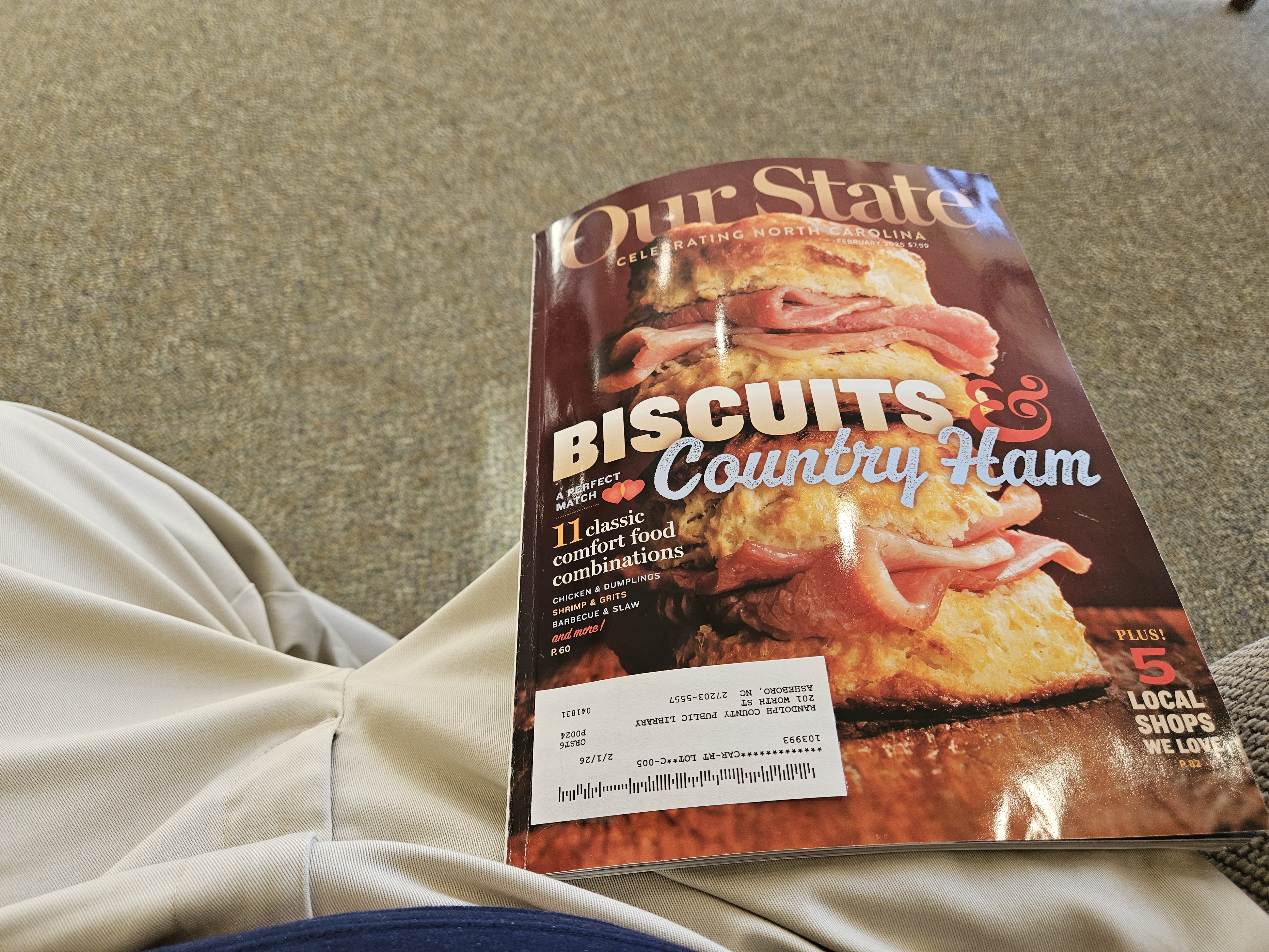 I told you Burge was next door.Finally, no breakfast special, but still about a $1 cheaper than most.Replacements, Ltd. Looking out from ManCave.Replacements, Ltd. Enjoying some reading.My classic Library view for reading a few books.Reading the February Issue of Our State MagazineLate afternoon sun shining on the magazine rack.