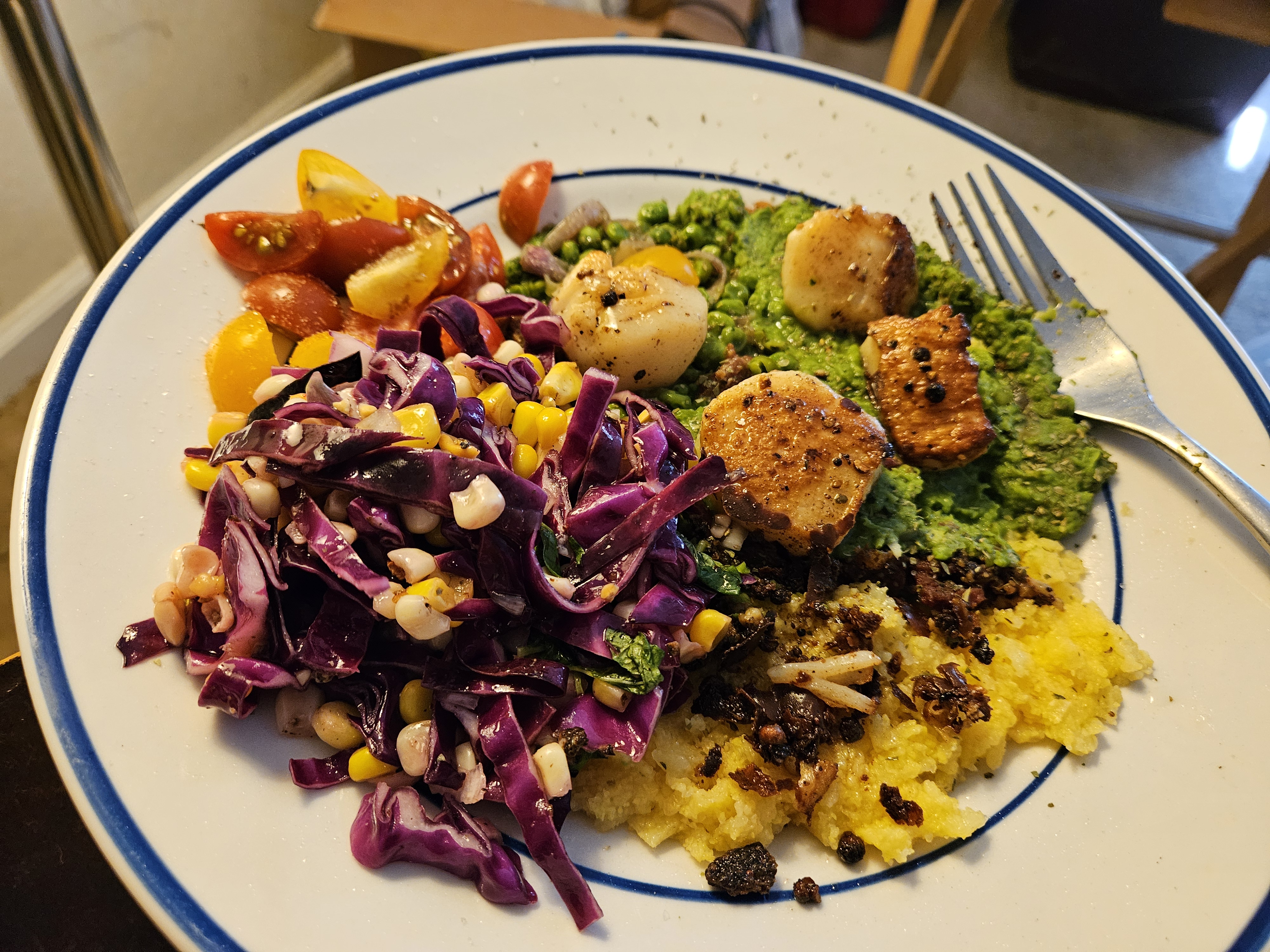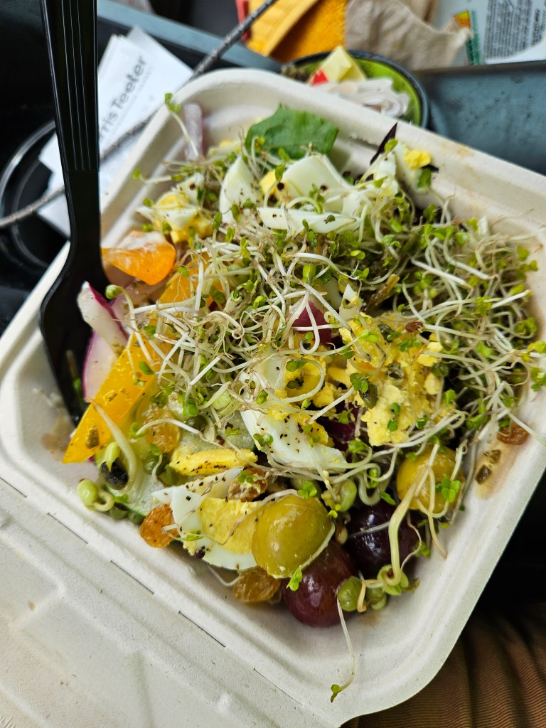 I make my egg salad from two hard boiled eggs (9 minutes), and mash them up with a little Dukes Mayo and Kerry Gold Grass Fed Butter, celery seeds, garlic powder, Dulse, cayenne powder, salt & some ground Long Pepper. *I had this breakfast this morning, but switched out the grape tomatoes for bacon.