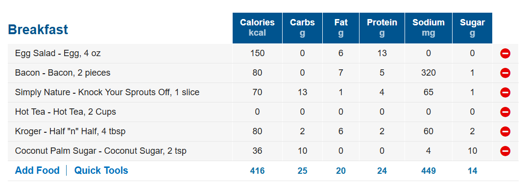 I can add the above breakfast meal, and then take off the bacon or the avocado if I choose not to have that on the specific meal. I’ve also just added “BK – Coffee,” and “BK – Hot Tea” items with their additions: half-n-half and/or Agave Nectar, Coconut Palm Sugar. I normally also add Splenda and Stevia. Maybe it’s sweetness overkill, but no individual artificial sweetener seems to provide the deep sweet flavor profile of sugar. *I’ve just renamed (had to copy first, and then save under new name, and then delete old meal) the breakfast meals starting with “BK – “. This causes all the breakfast meals & items to group together.