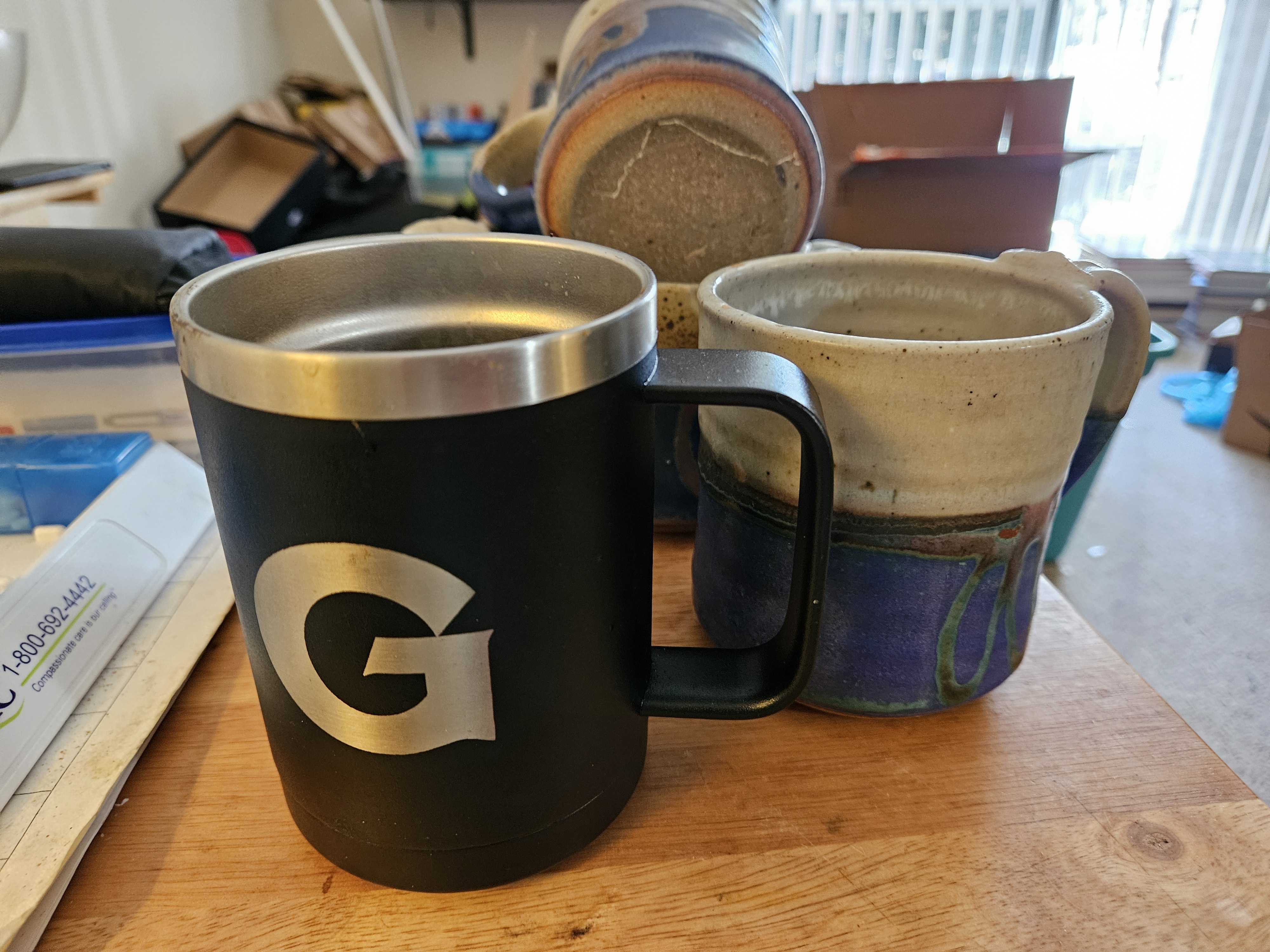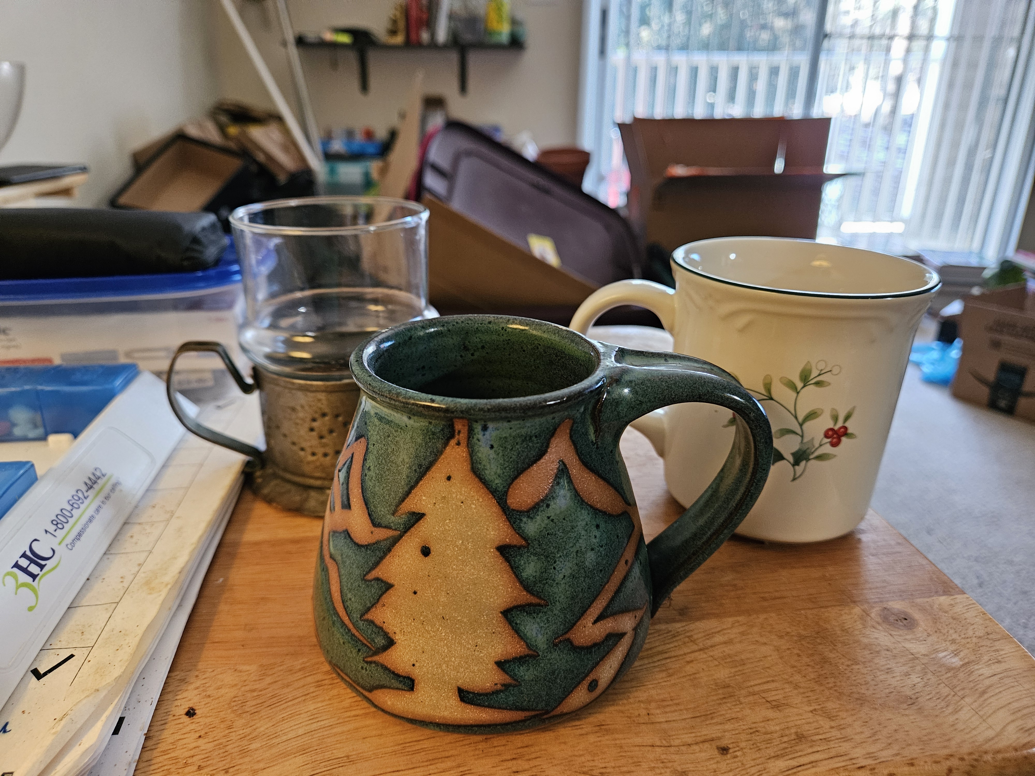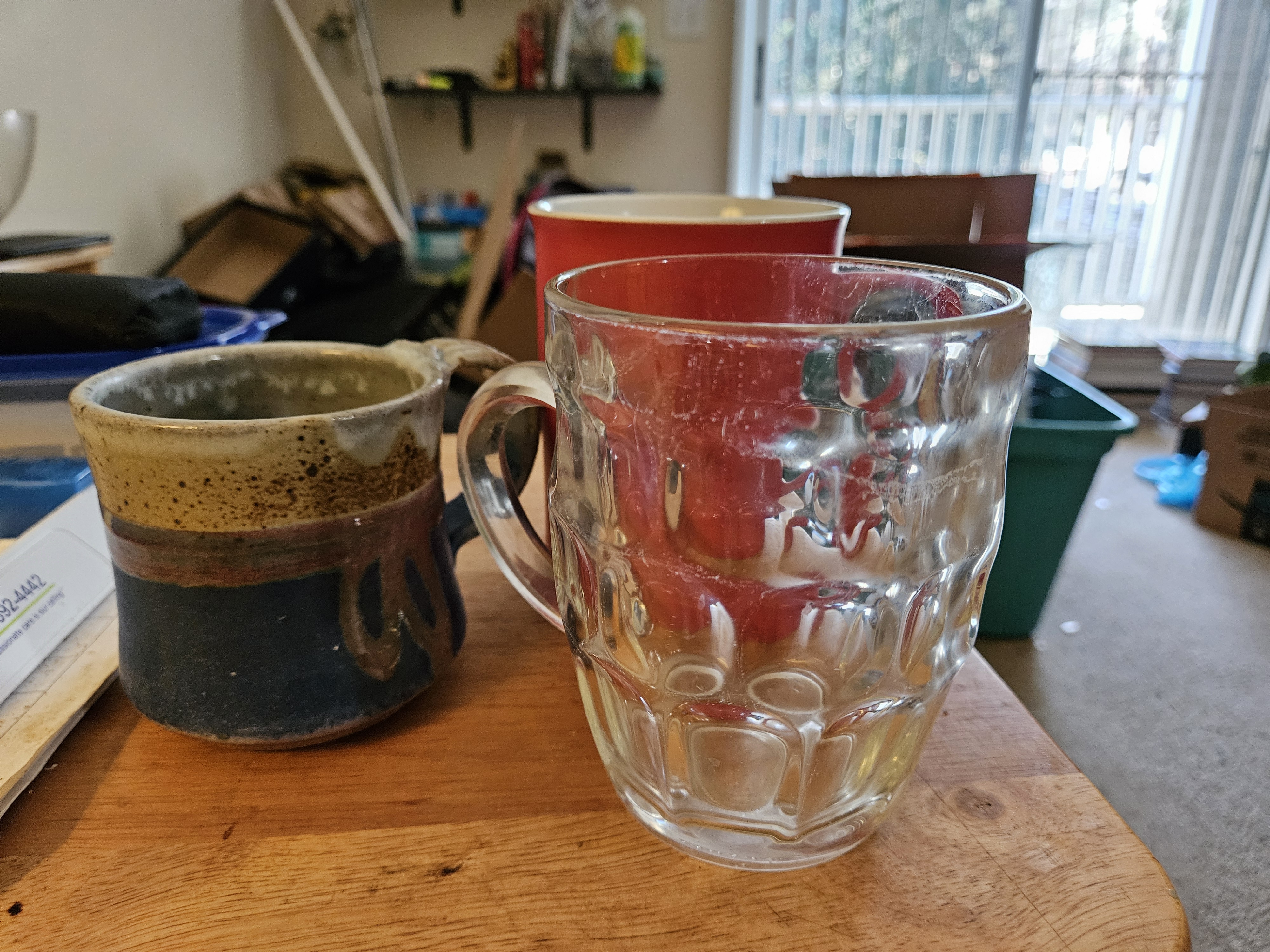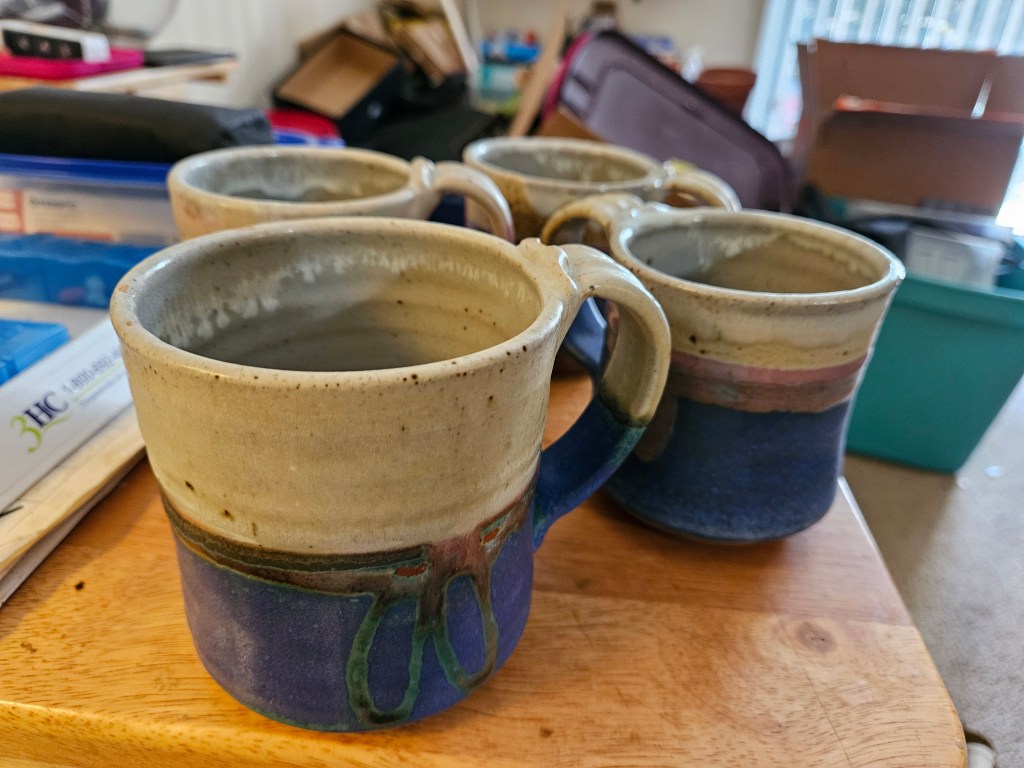 This may be the perfect spot to show my current coffee/tea cups/mugs. I’ve been thinking about getting rid of all but about three of them, but don’t quite know which three to keep. I did have a favorite, large, blue glass mug that cracked, and I didn’t replace it because of how expensive a replacement would be.