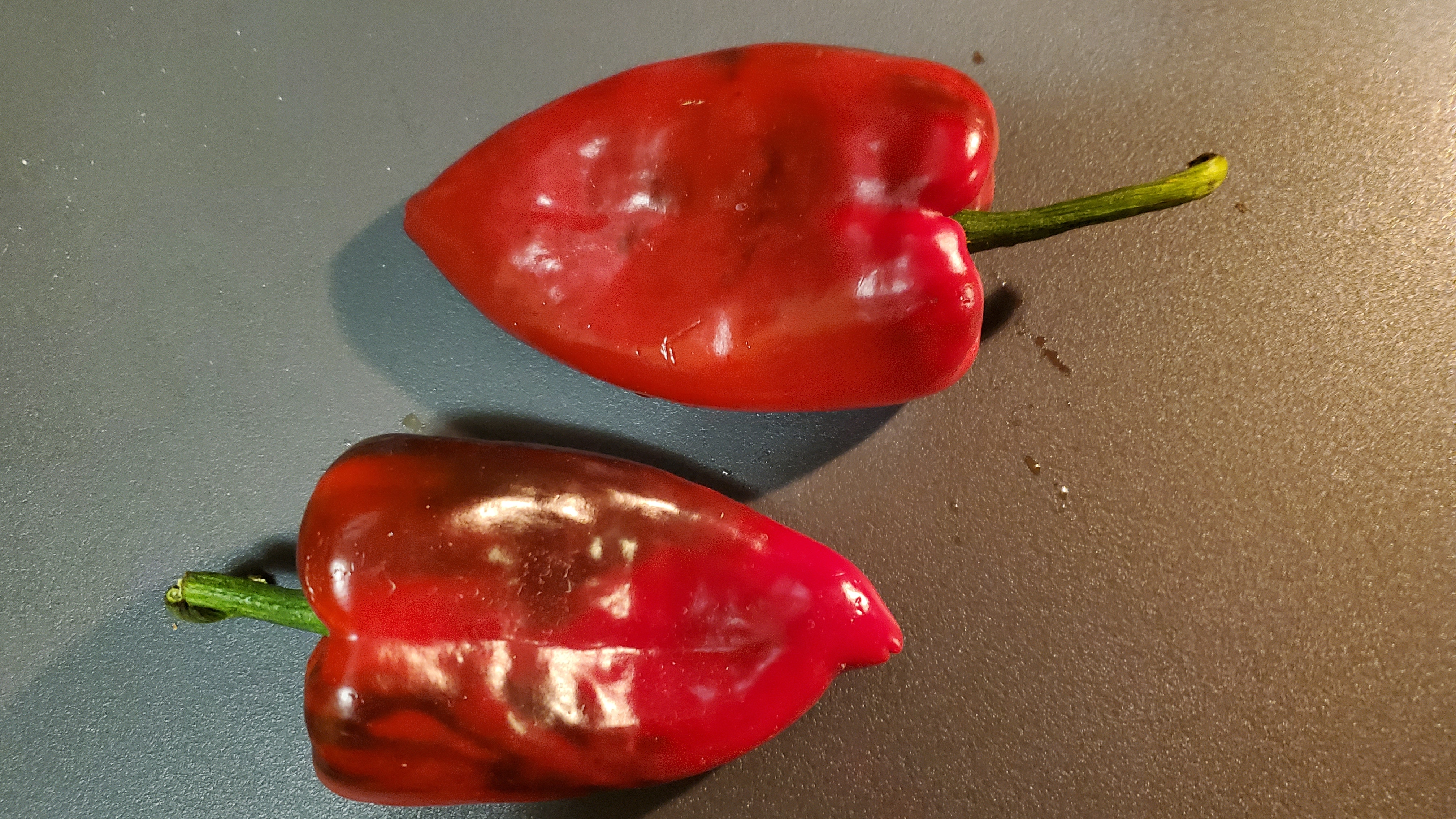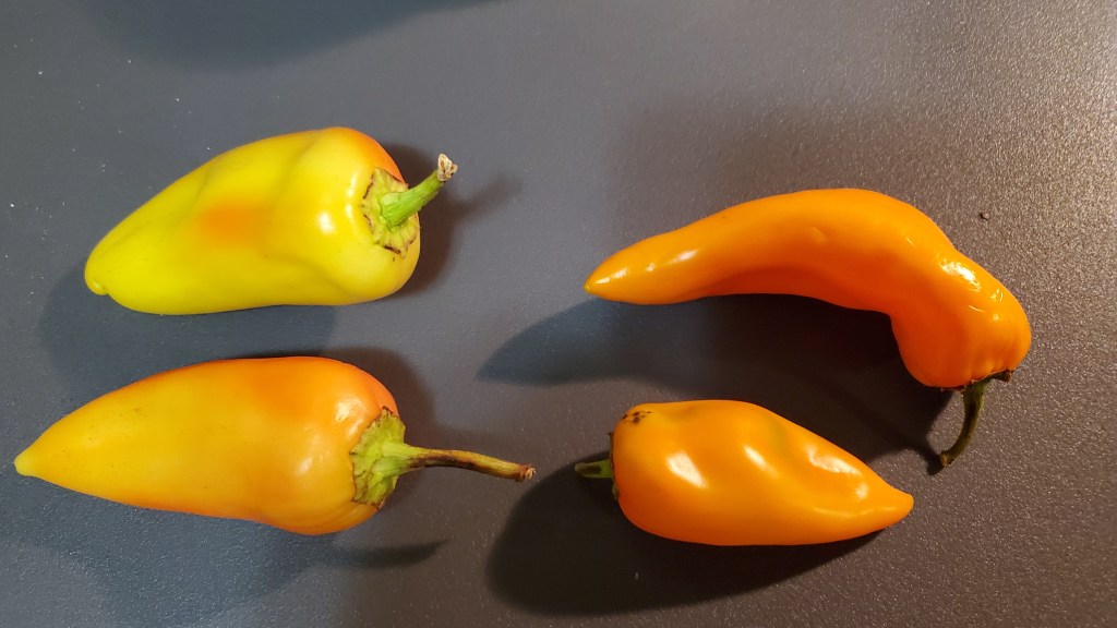 The four types of peppers shown below were supposed to be sweet/not hot and they were. The far right were red Poblanos. On the left, the more orange pepper had the sweetest flavor. The long red peppers in the middle had little flavor.