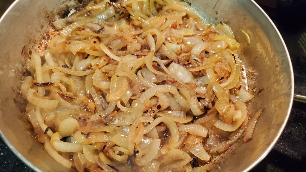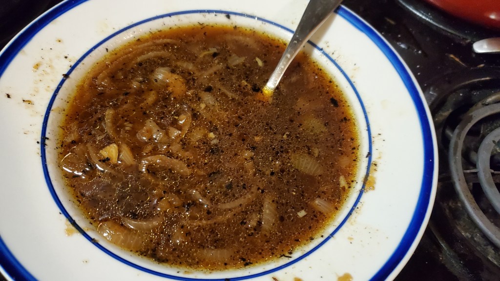 I plan to toast the bread I have, multigrain mountain white wheat bread, with some of the Swiss in my oven and just put it on top of the heated soup. There are several elements that are working against this soup being as good as I remembered. *In writing this, I just recalled that I probably made this for the second time several years ago after having some at Marquis’ Bistro Restaurant & Lounge which is part of the Double Tree by Hilton hotel next to I95 & a Cracker Barrel Restaurant in Fayetteville, NC. I don’t recall why I was at this hotel. I didn’t stay there. There may have been a work conference there, and then I decided to eat at the Bistro. The French Onion Soup was on their menu, I tried it, and was reminded of how much I had liked this the first time I tried it. More than likely, I tried making this at home again, but I recall no details.