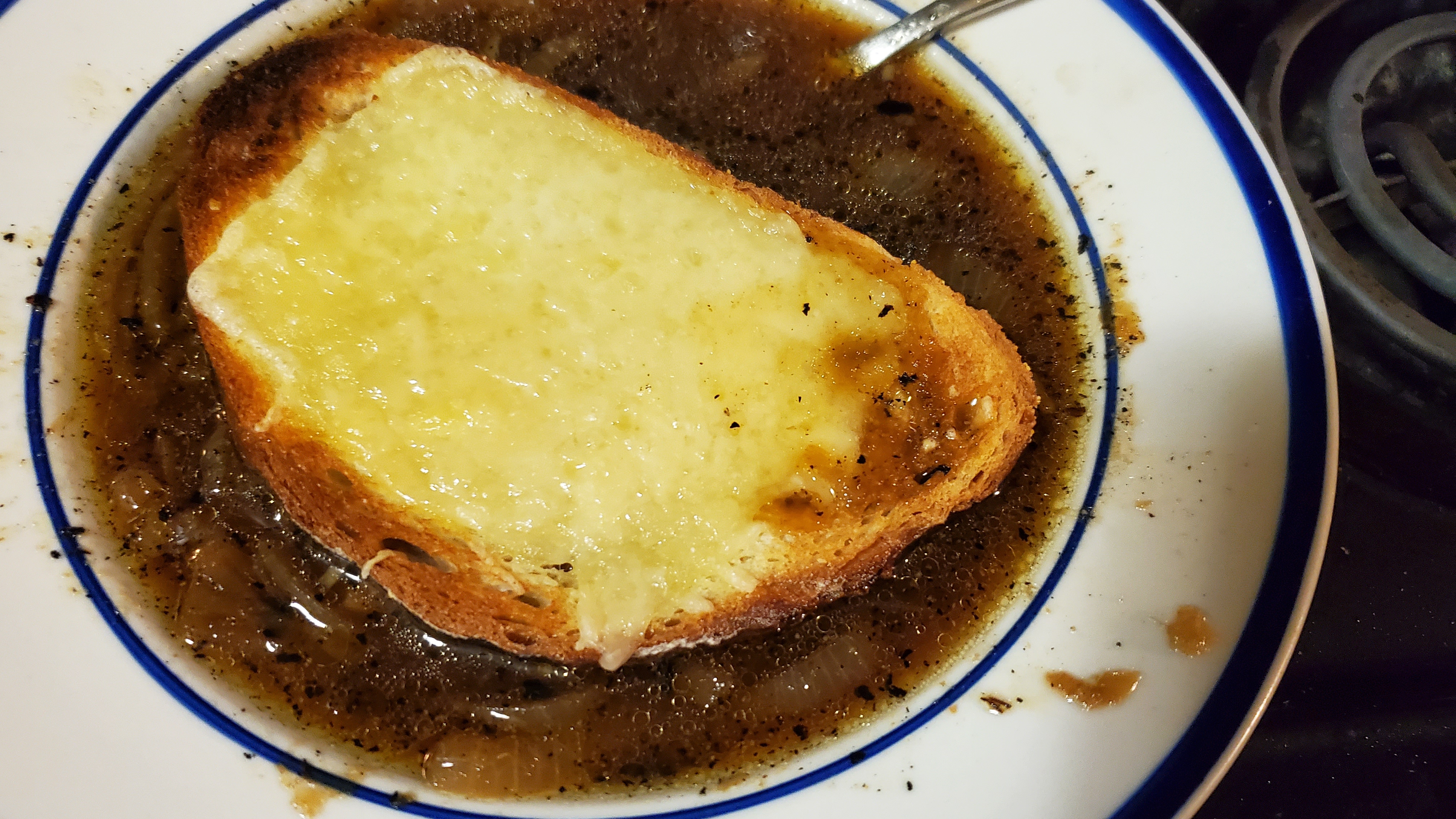 The melted cheese on the toasted bread worked very well. Eating the bread with the soup was a highlight.