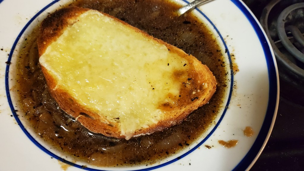 I put Swiss cheese on the mountain bread, and also grated a small amount of Parmesan cheese and toasted a couple of slices. I ladelled out some soup in a regular soup bowl and then placed the toasted bread on top. Surprisingly this soup turned out well. But, the beef broth could have been much better, and that is what I would focus on, if and when I make French Onion Soup again… at home.