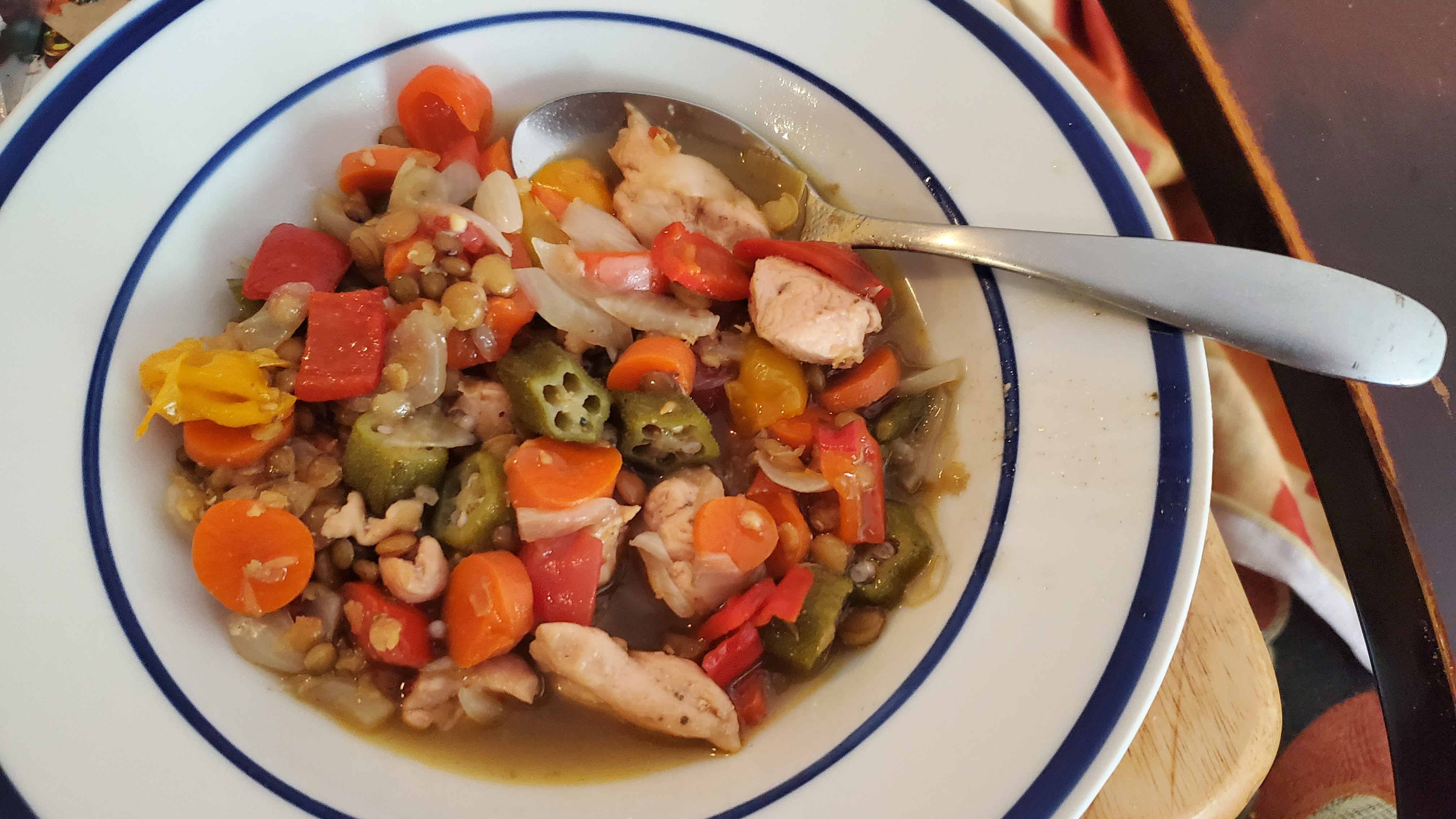 NOTE [ 09/16/23 ]: I had some mild peppers (bought at State Farmer’s Market – Raleigh) left and a few chicken strips. I also had just bought (yesterday at Pate’s) some good looking okra. This soup has chicken, lentils, carrots, peppers, okra, onions and a few small tomatoes cut up. Although I read online that you shouldn’t (or its not done) include okra and Gumbo File powder to your soups. Supposed to choose one or the other. I think Gumbo File powder is supposed to be used as a thickener. *This is made from Sassafras. I remember a long time ago that my mom and I were walking on the old farm, way in the back along a sandy road. I think there was a Sassafras plant growing in the middle of this path. We managed to cut out a little of the Sassafras root and took it back home and made hot tea out of it. With sugar, and some creamer, the Sassafras tea was good.